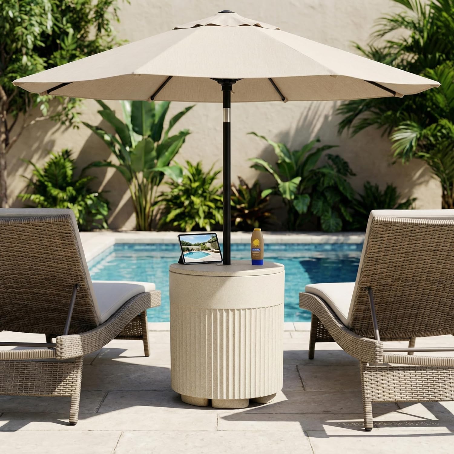 Trygoal Outdoor Table, Bladder Umbrella Base with Adjustable Knob, Water Filled Umbrella Base, All Weather Side Table Fits Up to 1.6" Pole, Up to 15 Inches of Water, for Beach, Yard, Garden, Beige
