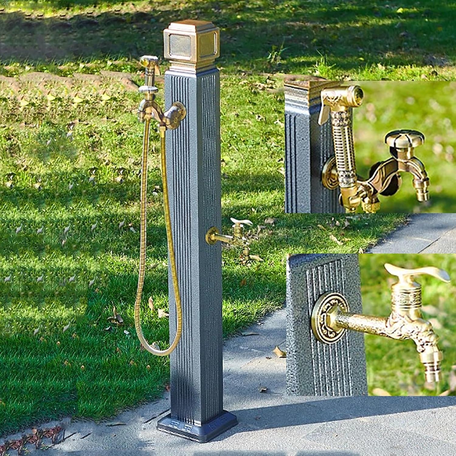Our water column is expertly crafted from durable, rust-resistant aluminum alloy and features freeze-proof insulation, making it a reliable choice for any weather conditions. This outdoor water column is designed for convenience, allowing easy connection to a water source for various applications such as garden irrigation, flower watering, car washing, or pet showers. **Key Features:** - **Versatile Water Inlets:** The water column includes both a side water inlet and a bottom water inlet, with the side inlet positioned just 7cm (2.7in) from the ground for easy access. - **Enhanced Flushing:** The 5mm (0.2in) water inlet diameter is complemented by a booster adapter, ensuring optimal flushing performance. - **Sturdy Installation:** The base of the column is pre-drilled for secure floor mounting, preventing any tilting or instability. - **Durable Faucets:** Our solid brass faucets are designed to resist rust and wear, ensuring long-lasting use. - **Winter Protection:** Each faucet comes equipped with an anti-freeze bag, providing protection against freezing and cracking during colder months. - **Robust Construction:** The aluminum alloy structure offers both strength and durability, suitable for outdoor use. - **Insulated Design:** The internal anti-freeze thermal insulation layer protects against summer heat and winter cold. - **Practical Hose Storage:** Includes a convenient hang hook for your garden hose reel, effectively minimizing tangles and kinks. **Specifications:** - **Material:** Aluminum alloy for the column, solid brass for the faucet - **Inlet Types:** Dual-purpose side and bottom water inlets - **Dimensions:** Height of 110cm (43in), with the faucet positioned 87cm (34in) above the ground and the side water inlet at 7cm (2.7in) above the ground. **Packing List:** - Water Column with Faucet - Faucet Anti-freeze Bag - Booster Adapter - Essential Accessories Upgrade your outdoor watering experience with our reliable water column, de