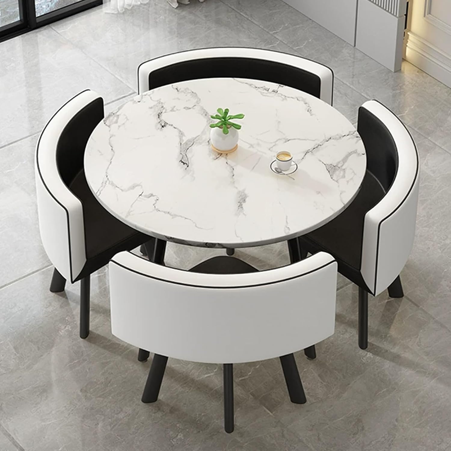 Features:The wooden tabletop design office reception room club table is equipped with a stable metal support leg, which is stable in load-bearing and has a rebound sponge seat for a comfortable sitting experience.reception and negotiation table and chair combination has a simple and personalized design structure, and a stylish and stable appearance. It is a good choice whether it is placed in an office reception room or a living room at home.Product parametersProduct name: Negotiation Reception Tables and Chairs Style: simple and modernStructure material: metalTable shape: roundTable diameter: 80cm/31.4inTable height: 75cm/29.5inChair material: leatherChair total height: 73cm/28.7inApplicable number of people: 4 peoplePacking method: assemblyPacking list: 1 table, 4 chairs (excluding decorations)Warm Tips:1. Size description: The product is completely measured by hand, and there may be an error of 1-3 cm, please understand.2. Picture description: Due to problems such as light, angle, and display, there may be slight color difference, please refer to the actual product.