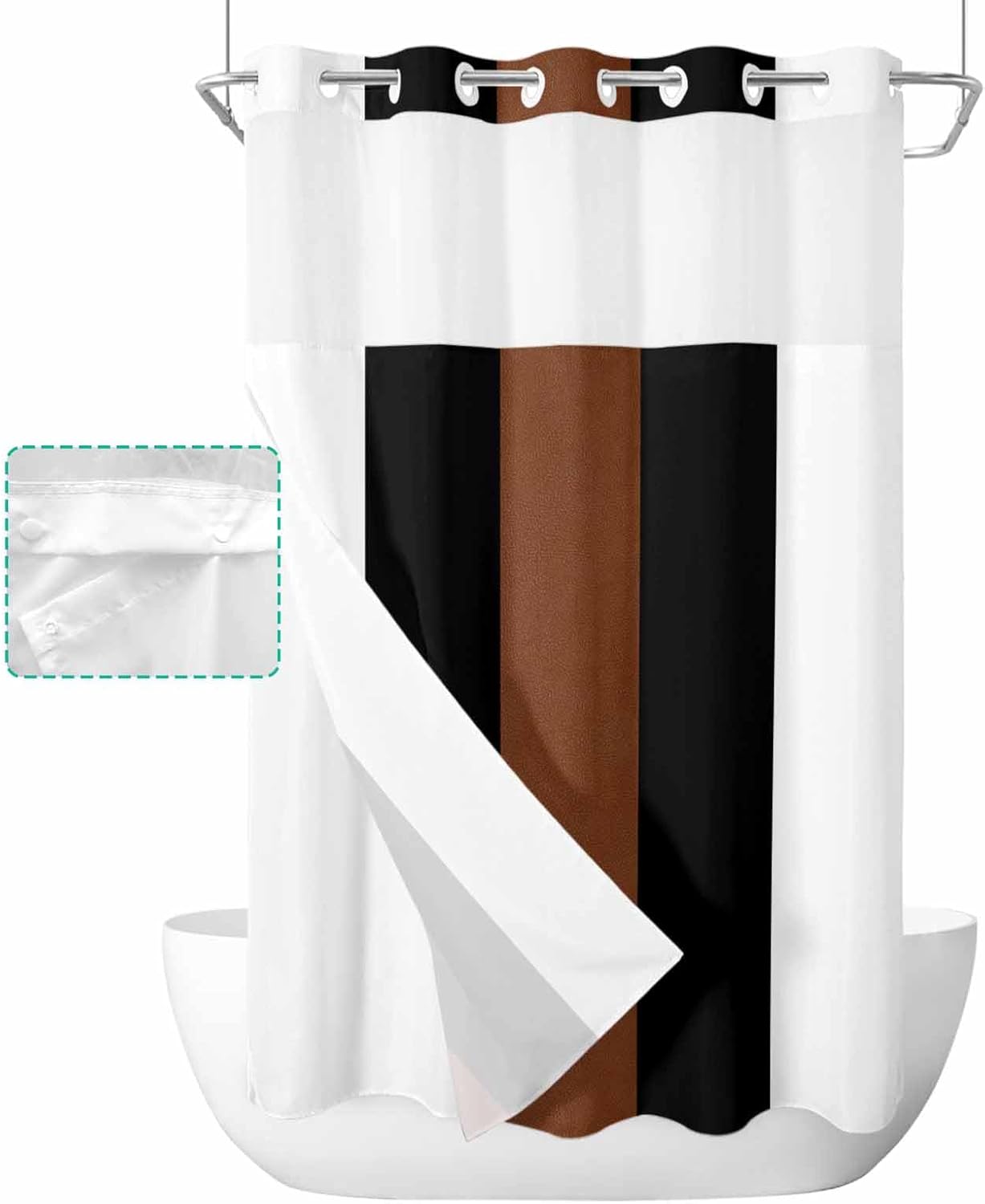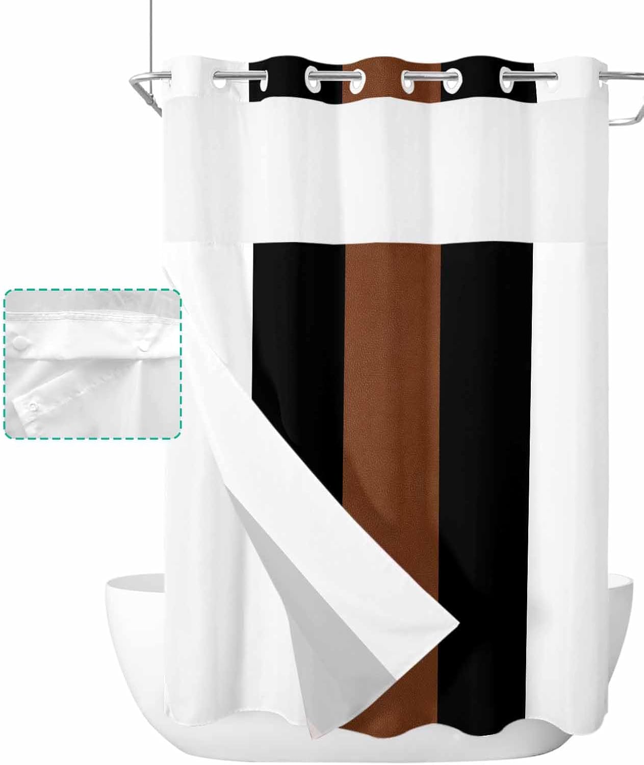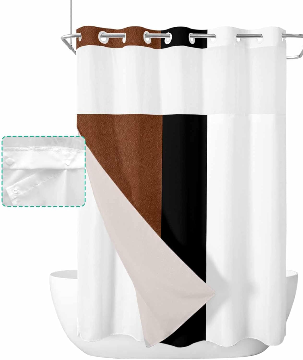 The shower curtain with snap lining brings convenience to daily life while adding a stylish lifestyle to your bathroom. It's the best choice for you to relax and enjoy a comfortable bathing time in your own bathroom. Specifications: Product: Shower Curtain with Snap in Liner Material: 100% polyester Size: 36"W x 72"L 36"W x 78"L 48"W x 72"L 54"W x 78"L 60"W x 72"L 66"W x 72"L 72"W x 72"L 72"W x 84"L 72"W x 78"L 72"W x 96"L No Hook Bathroom Set with Snap-in Liner: 1. Waterproof fabric: Our shower curtain with liner is not only waterproof and stain-resistant but also dries quickly. 2. Easy to install: No hook design effortlessly hook up the shower curtain on the rod within seconds. No extra hooks are required, easy to install and convenient. 3. Snap in Liner: Snap-in fabric liner is removable for cleaning without removing the entire no hook shower curtain with snap in liner. 4. Sheer Window: A clear window along the top lets light in, gives you a bright showering space with plenty of air circulation while keeping privacy. 5. Magnets on the corner: Help keep in place and prevent water from splashing out when taking a shower. 6. Fits anywhere you want: Home, camper, apartment, gym, hotel, dorm, bedroom, spa. 7. Easy care and clean: Machine or hand-washed to keep it clean. Do not bleach and tumble dry on low. Warm tips: 1.Due to manual measurement, please kindly allow 1-2 cm discrepancy. 2.Due to different in pc monitors resolutions, the actual color may vary slightly.